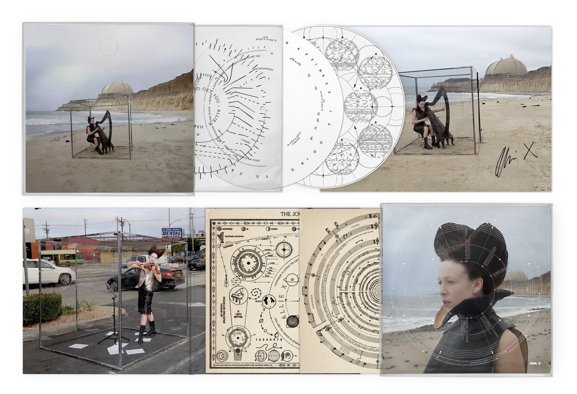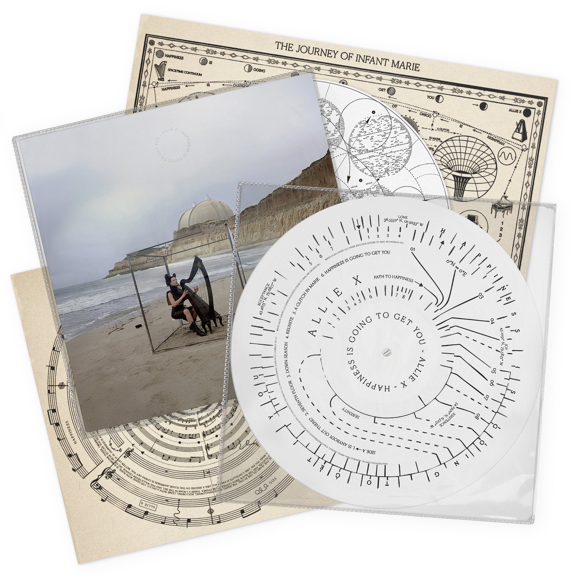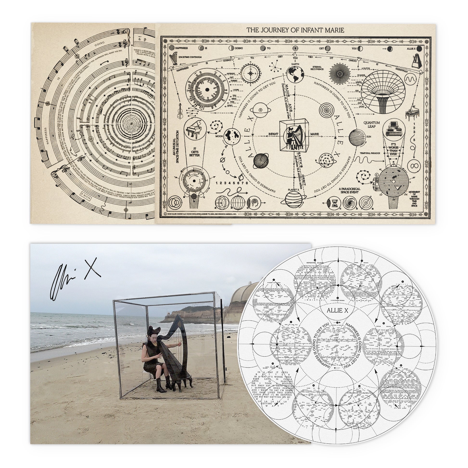 Gatefold packaging. "Coordinates" picture disc in transparent sleeve with matching print. Circular insert with lyrics and credits. "Journey of Marie" poster. "Higgy Music Folio" insert. Signed print.